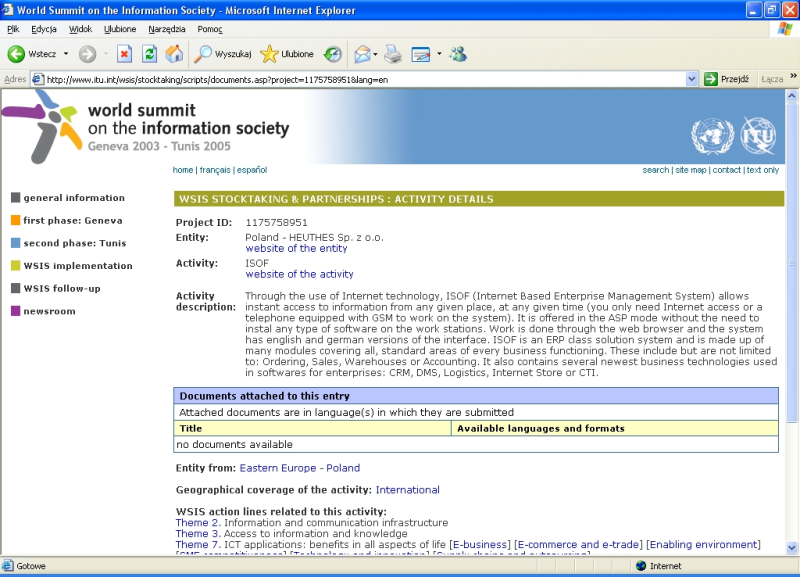 Dwa rozwiązania firmy HEUTHES zostały zaindeksowane w światowym katalogu rozwiązań dla społeczeństwa informacyjnego prowadzonym przez Międzynarodową Unię Telekomunikacyjną (ITU), agendę ONZ. Chodzi o system ISOF (Project ID: 1175758951) oraz program szkoleń e-learningowych ISOF dla Uczelni (Project ID: 1175759102).