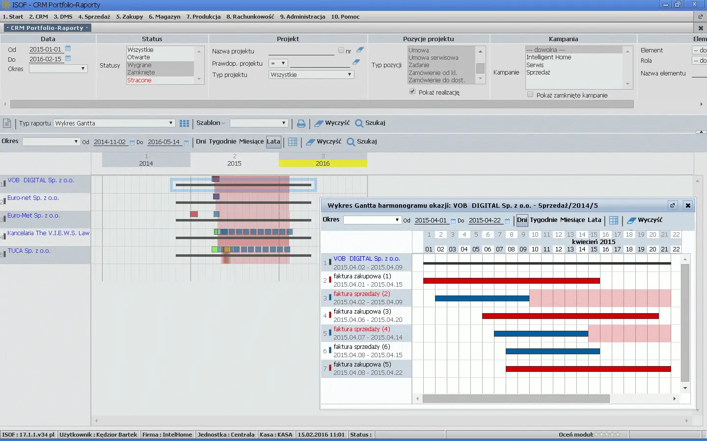 Dane można dodatkowo analizować według kampanii, w przekrojach czasowych, dla pracowników i kontrahentów. Każda pozycja raportu, po kliknięciu, dostarcza szczegółowych danych, jak: elementy projektu, czyli to, co sprzedawane jest klientowi, harmonogram zadań realizowanych w ramach projektu, informacje o konkurencji, aktywności czy podłączone dokumenty.